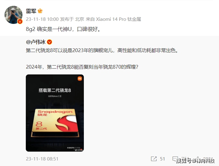 另外Redmi K70极有可能是基于高通骁龙8Gen 2平台打造的,这是因为在11月18日卢伟冰表示:第二代骁龙8可以说是2023年的旗舰宠儿,高性能和低功耗都非常出色,2024年和二代骁龙8能否复刻当年骁龙870的辉煌?随后雷军转发了卢伟冰的消息,讲到“8Gen 2确实是一代神U,口碑很好”。