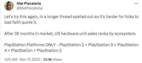 他写道:“在进入市场36个月后,美国硬件销量按生态系统排名来看的话,只有PlayStation平台——PlayStation 2 > PlayStation 5 > PlayStation 4 > PlayStation > PlayStation 3。”