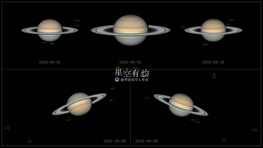 江苏星空摄影爱好者陈苏辉2023年8月和9月在江苏南通拍摄到的土星特写(拼版照片)。(本人供图)