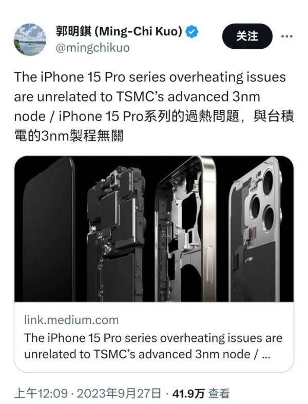 9月27日,天风国际分析师郭明錤发文,针对目前苹果iPhone 15 Pro手机过热问题进行了解读,并表示“与台积电3nm制程无关”。