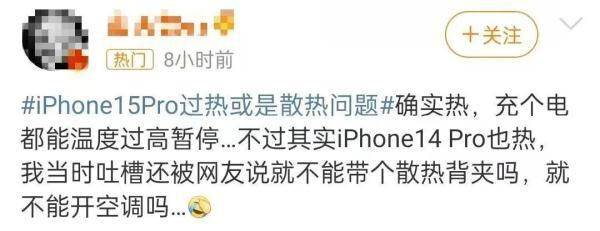 还有用户反馈,自己的iPhone 15 Pro机型手机放在口袋中也会发热,温度高到都快烫伤人了,以至于他无奈将其取出。网友还做了表情包,调侃iPhone 15系列都可以煮东西了。