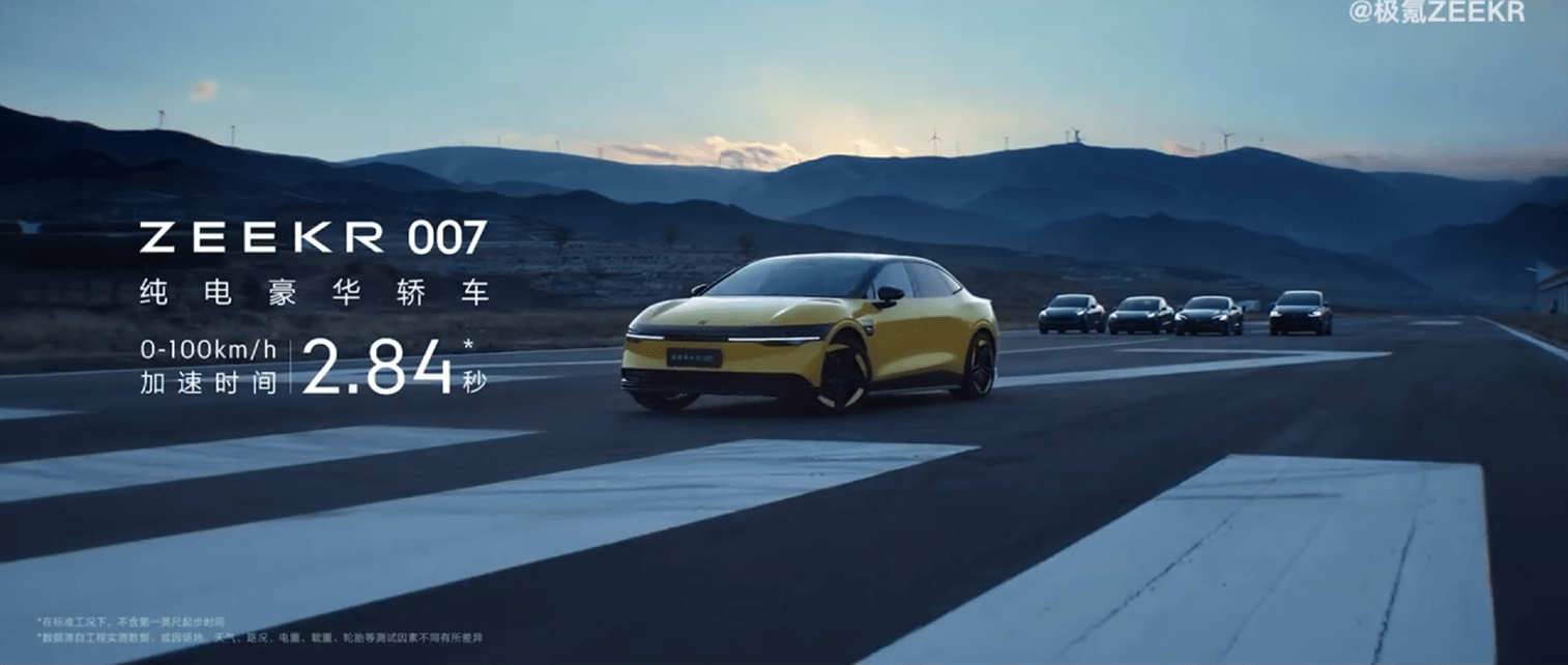 毫无疑问,这只宣传片用「碾压」全系特斯拉的方式,突出极氪007的零百加速。事实上,极氪官方在广州车展前(11月16日)就放出了这支宣传片并推出「一台车PK特斯拉全系」的话题。在发布会当天,揭秘「ZEEKR 007 纯电豪华轿车 0-100km/h 加速时间 2.84秒」。
