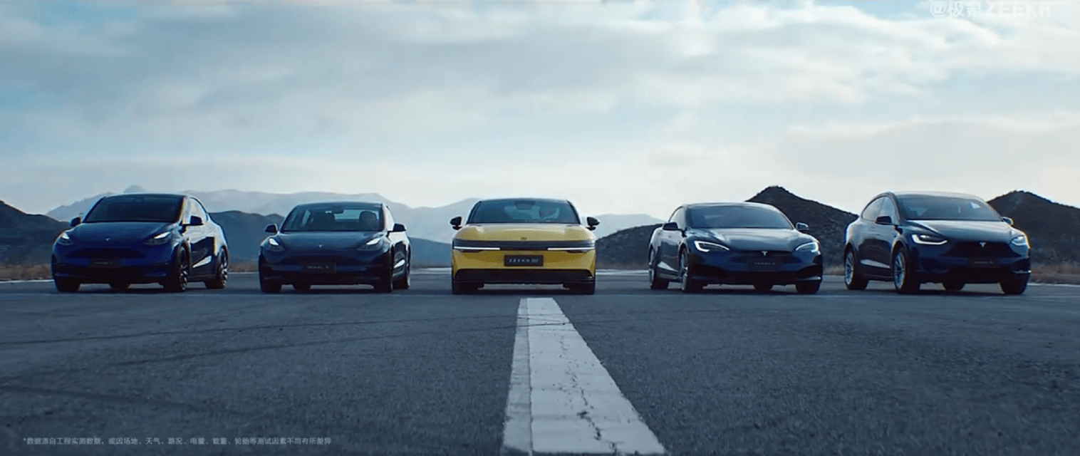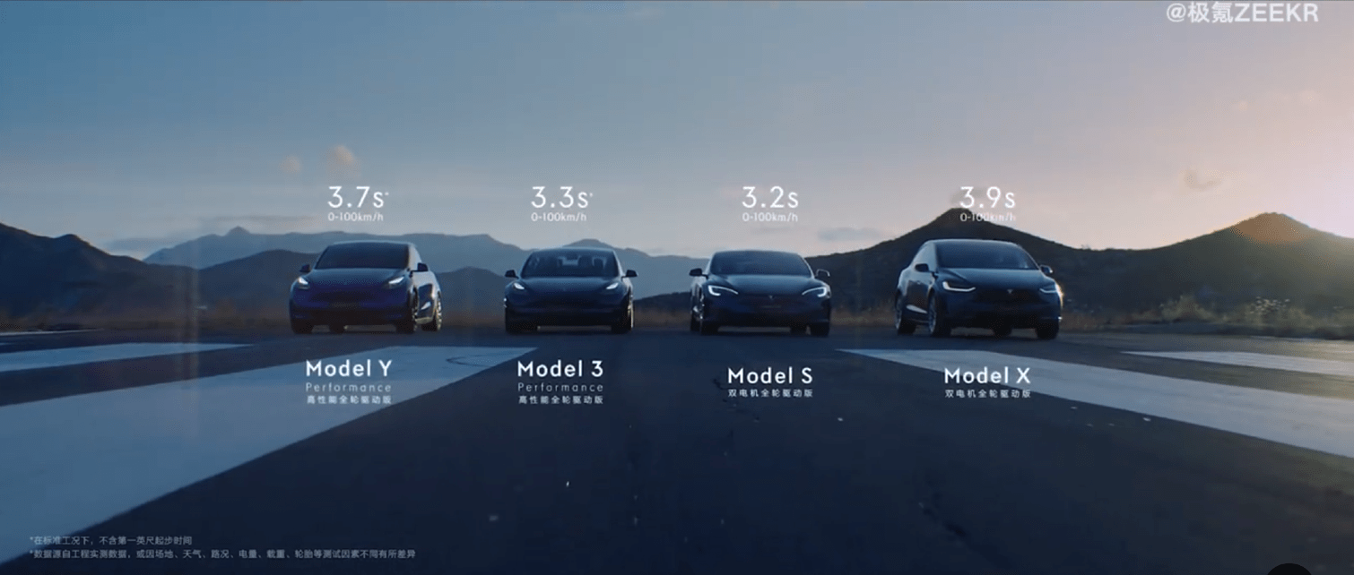 在这支一分半钟的宣传片里,开启竞速模式的极氪007,将四辆特斯拉——Model Y Performance高性能全轮驱动版、Model 3 Performance高性能全轮驱动版、Model S双电机全轮驱动版、Model X双电机全轮驱动版——甩在身后,尤其是影片最后那个帅气的甩头,极氪007和特斯拉对峙的画面,相当的挑衅和热血。