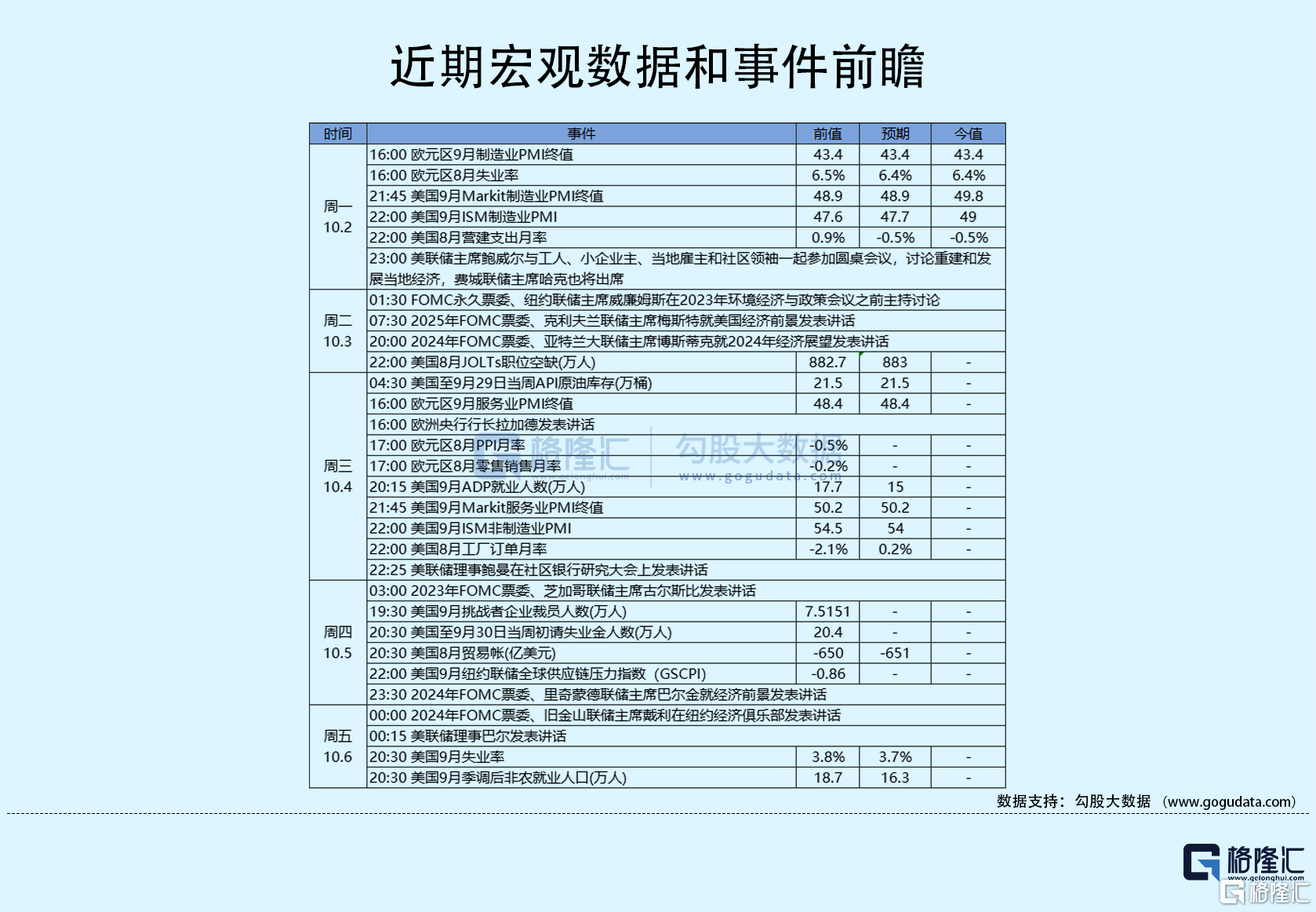 美联储主席鲍威尔将于北京时间10月2日晚11点与工人、小企业主、当地雇主和社区领袖一起参加圆桌会议,讨论重建和发展当地经济,费城联储主席哈克也将出席。美国通过短期支出法案,将政府资金支出延长45天至11月中旬。劳资谈判破裂,美国最大规模医疗罢工或将上演。