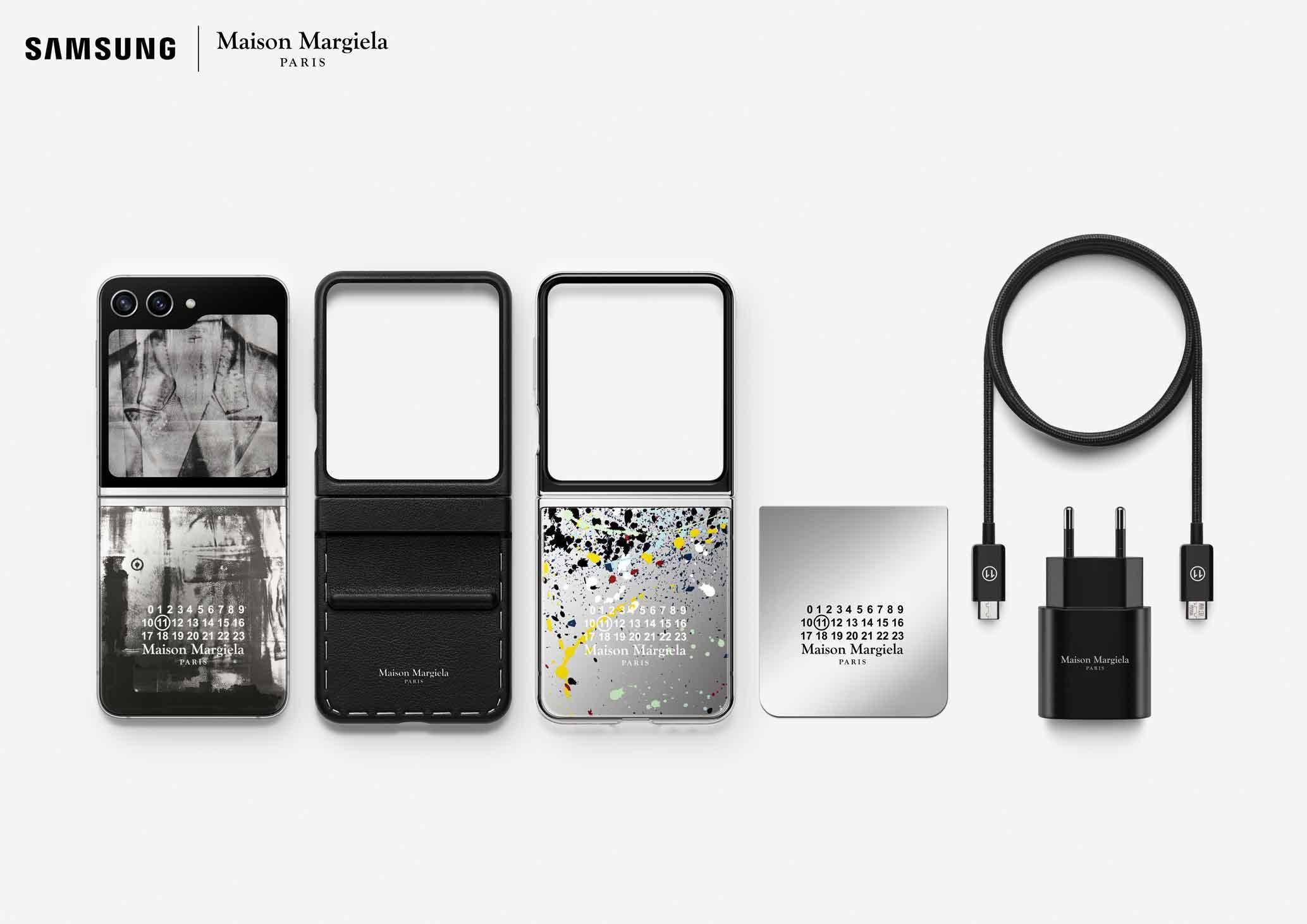 作为三星与Maison Margiela第二次邂逅的重磅杰作,三星Galaxy Z Flip5 Maison Margiela限量版从内到外都充满了对于常规范式的突破与创新。机身背板在银色与金属光泽的映衬下,展现了Maison Margiela外套的内部纹理,以半透明的错视画艺术效果(Trompe-l’oeil)揭示出了服装中的隐藏结构和细节。黑色的皮革保护壳采用了缝线设计,演绎出了“未完成感(Work-in-Progress)”理念。另一款智能主题保护壳则附带了两张NFC交互卡片,一张采用了泼墨设计,另一张是镀银金属风格,在把卡片放入保护壳内并贴合手机背部,待手机识别后,便会激活专属的外屏主题。另外,本次包装盒以及其他配件也都融入了Maison Margiela的特色标识,时刻传递着追求原创性、开放性的品牌精神。