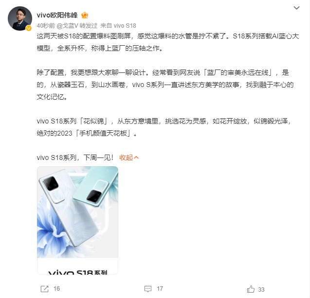 vivo S18系列的设计主题是“花似锦”,灵感来自东方意境中的花朵,象征着花开绽放和锦绣光芒。官方表示,该系列将主打高颜值,被称为2023年的“手机颜值天花板”。