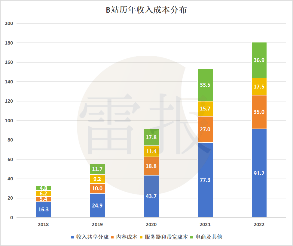其中,“收入共享分成”是给游戏开发者、APP渠道、支付渠道,以及给UP主视频和直播的分成。随着B站收入成本的逐年增长,到了2022年,这一块成本达到了91亿元。