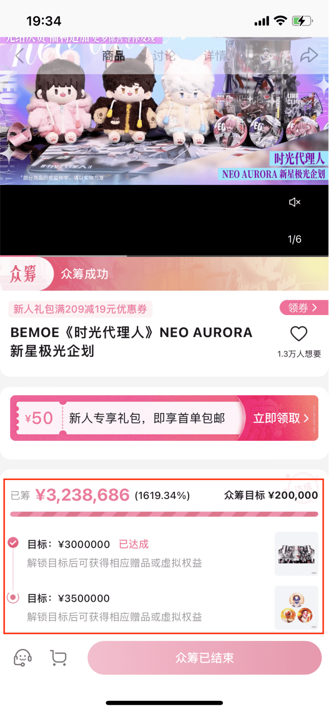 IP衍生品方面,根据B站会员购官方数据,随着《时光代理人2》热播,“BEMOE《时光代理人》NEO AURORA新星极光企划”项目共筹得323.8万元,这也是B站今年众筹金额最多的项目。该项目设置了从20万起的9个金额解锁目标,但离350万的最终解锁目标还是差了一点。