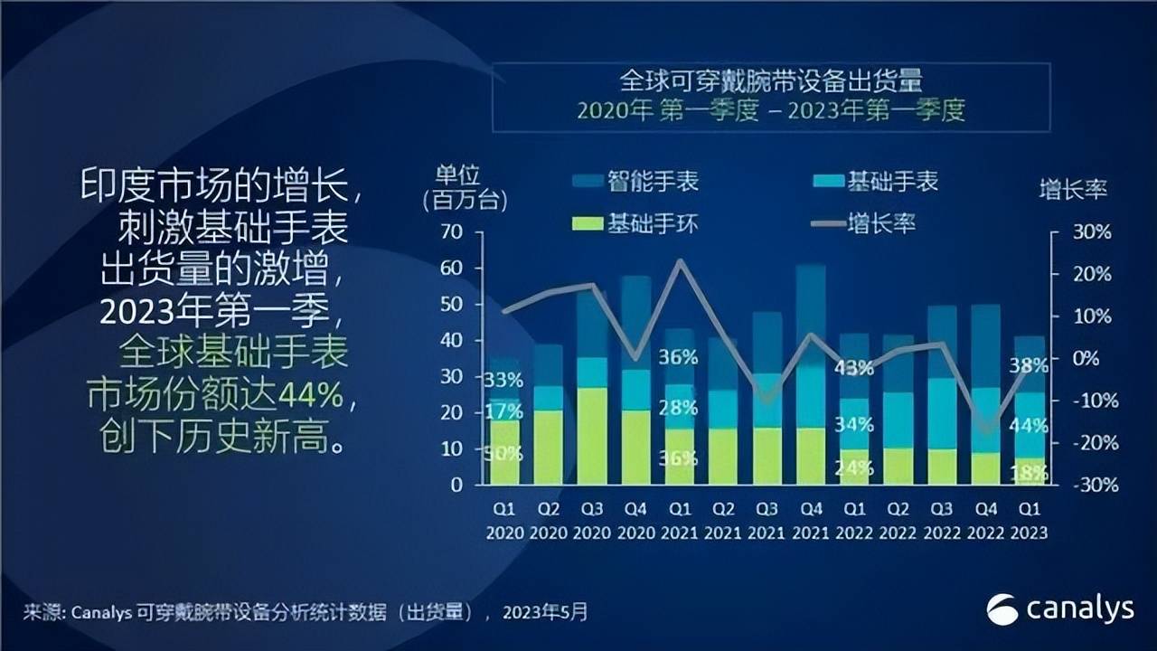 特别是近几年,由于居民对于健康意识的不断提升,以及行业技术的不断创新,全球智能可穿戴设备更是呈现井喷式增长。据Canalys数据显示,2023年第二季度,全球智能可穿戴腕带设备的出货量达到4400万台,同比增长6%。