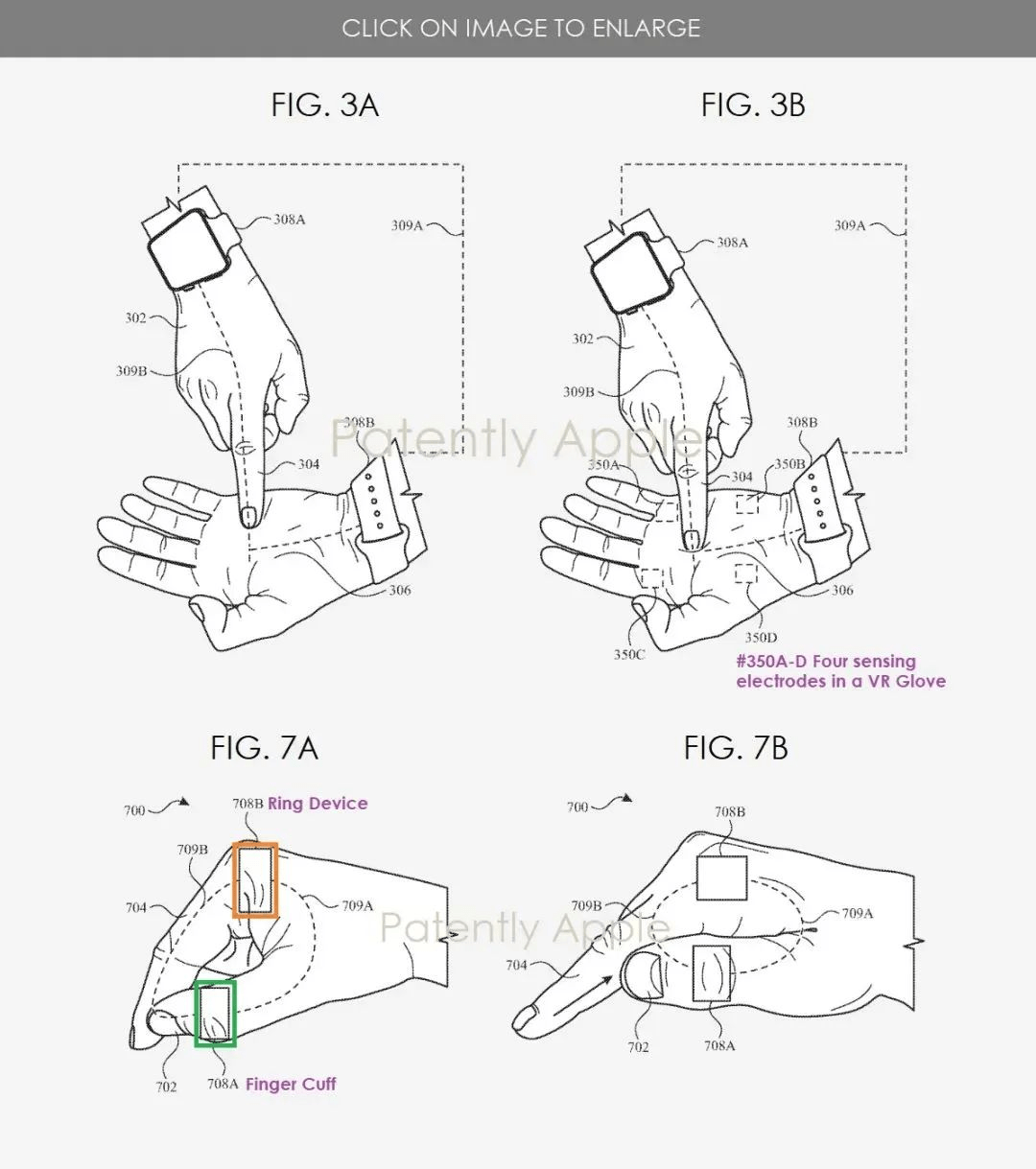 而苹果的专利图更加详细,头显中的摄像头可用于跟踪手指的移动,以检测手指在另一个手掌上的移动轨迹,从而在虚拟世界中实现打开文档、页面滚动、GUI 交互等操作。