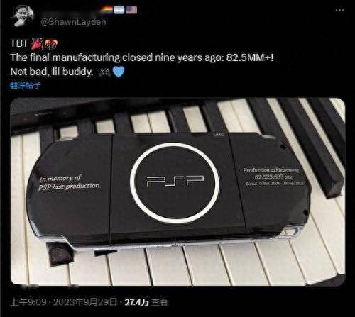 他在个人社交平台上写道:“9年前最终制造关闭:卖了8250万台+!不错啊,小家伙。”并展示了一张图,图上是一个经过特别雕刻的PSP。在其中一侧写着“纪念PSP最后一代产品”。另一侧则写到:“生产成就——2004年11月9日至2014年9月26日期间生产了82523607台。”