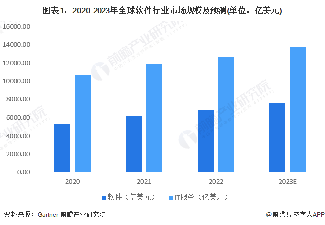根据Gartner数据显示,近年来全球软件市场规模不断扩大。2022年全球软件支出额为6748.89亿美元,IT服务支出额为12651.27亿美元。在基础设施软件支出继续超过应用软件支出的推动下,软件市场预计将在2023年实现高增长。2023年,全球软件市场规模将达到7548.08亿美元;IT服务支出规模将达到13728.98亿美元。