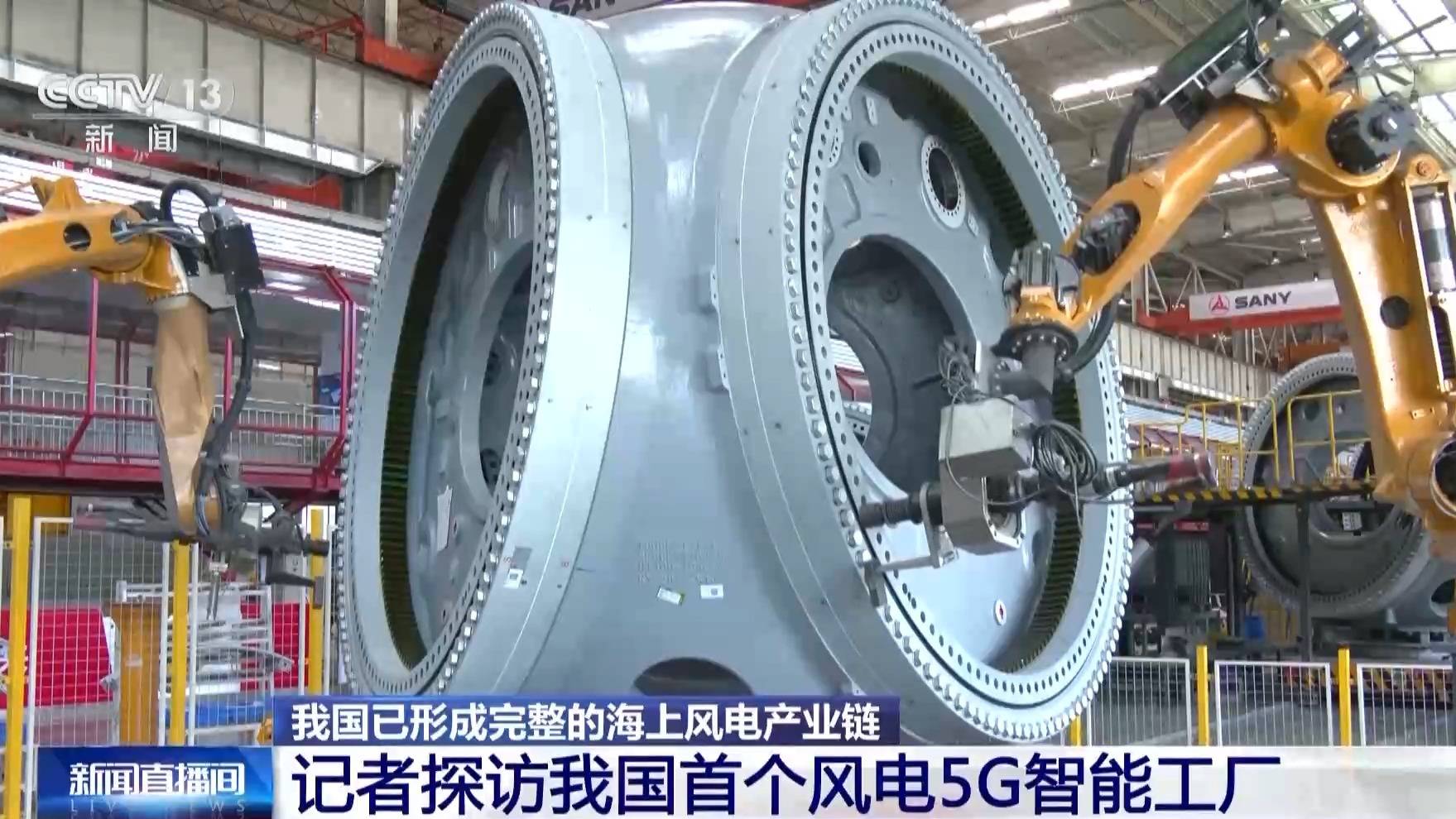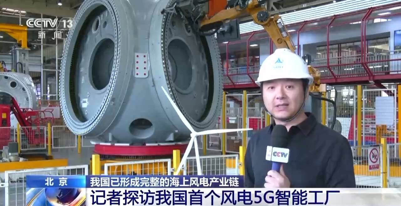 总台央视记者 古峻岭:这里是我国风电行业首个5G全连接智能工厂,它最大的变革,是将我国风电主机传统的定点装配模式升级为流水线作业。传统的定点装配模式是主机定点不动,工作人员和零部件都集中到这里,像搭积木一样,在这个位置上定点装配完成。这种传统定点装配模式,它一天只能装配3—4台主机,而在现在的流水线上作业,一天则可以装配6-8台主机,效率翻倍,但是用工却减少了一半。