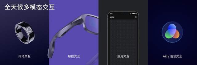 Flyme AR 基于用户的全天候舒适佩戴需求,独创了信息屏设计,让常规信息以原子化组件在眼前呈现。四个圆环构成的原子化组件分别显示设备、环境、个人健康、Aicy助理等与用户息息相关的全天候信息。Flyme AR 同时带来了全新的 Smart Bar 交互设计,让智能眼镜也能具备直观、简洁、丰富的信息交互体验。此外,MYVU AR 智能眼镜还支持指环交互、触控交互、手机交互和语音交互等多模态交互方式,打破了传统交互的界限,带来了前所未有的多维直觉交互体验。
