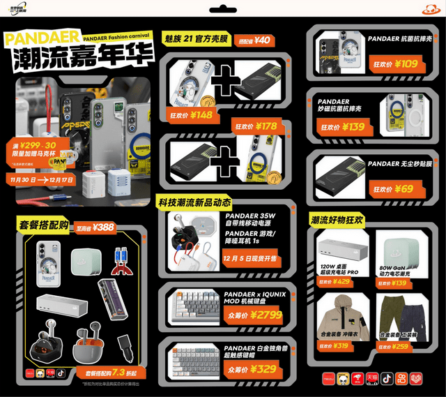 包括拥有多款全新主题的魅族 21 PANDAER 妙磁抗菌抗摔壳与魅族 21 PANDAER 无尘秒贴钢化膜,为魅族 21 提供抗菌又安全的保护;PANDAER 35W 自带线移动电源,采用线机一体式设计,让出行更轻便,续能更持久;PANDAER 降噪耳机 1s 与 PANDAER 游戏耳机也正式发布,低延时、高颜值,为用户带来全新升级的更出色连接体验;拥有全新设计及工艺的 PANDAER MOD 机械键盘与全新主题的白金独角兽超触感键帽也于发布会上亮相,11 月 30 日同步开启超限量众筹。潮酷搭档,时尚玩家,PANDAER 只为高颜好品质。