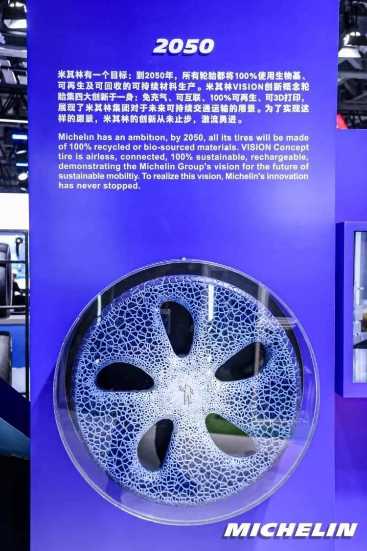 本次展览米其林展示了VISION创新概念轮胎。这款轮胎使用先进材料和3D打印技术,可根据行驶状态改变胎面,并且百分百可再生。VISION既是轮毂又是轮胎,是把轮胎、服务和材料集于一体的交通解决方案。这一创新成果的灵感源于自然。