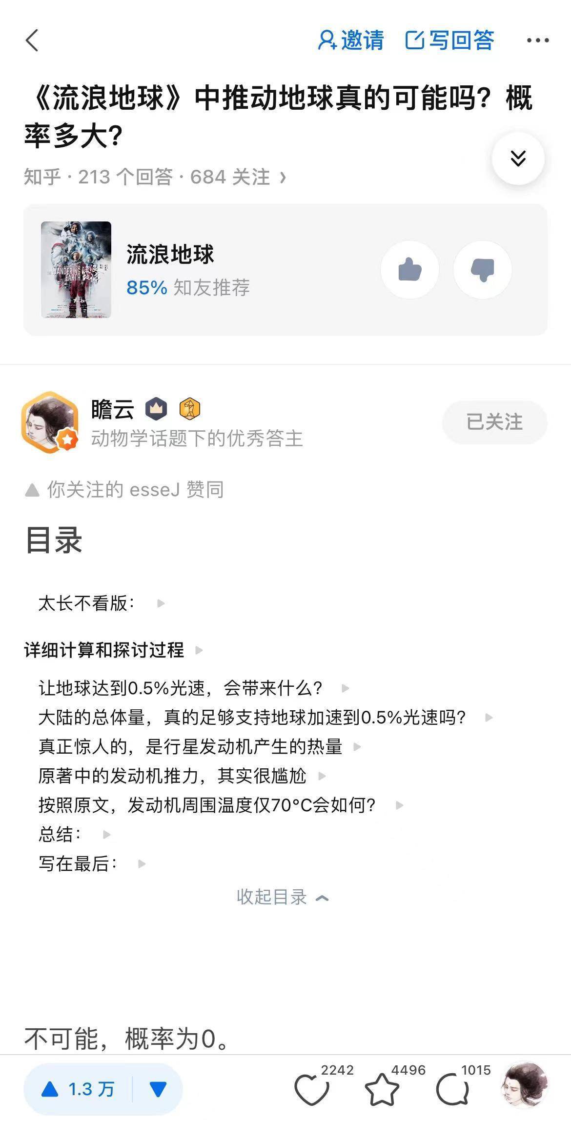 宋云江则认为,好的科幻作品离不开人类科学基础,需要有惊人的想象力,同时对人性和社会有所思考。知乎上有一则问题,“《流浪地球》中推动地球真的可能吗?概率多大?”,宋云江在回答中认为这种概率为零,他以火箭方程为基础进行了深度分析,获得知乎用户1.3万赞同。宋云江用三个词定义自己在知乎的回答:专业、硬核、脑洞。
