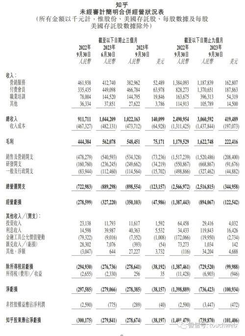 知乎2023年第三季净亏损2.78亿元,较上年同期的3亿元收窄6.5%;经调整净亏损为2.25亿元,较上年同期的经调整净亏损2.51亿元收窄10.1%。