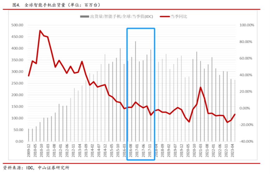 创新周期,意味着一个0-1的爆发,继而1-100的扩张。比如手机的这些年的创新周期,就是从传统功能机到智能机的完全切换。这个过程从2009年开始,在2016年达到顶峰。智能机的渗透率、保有量、出货量,均达到高峰。