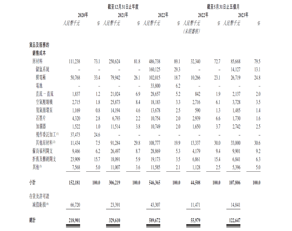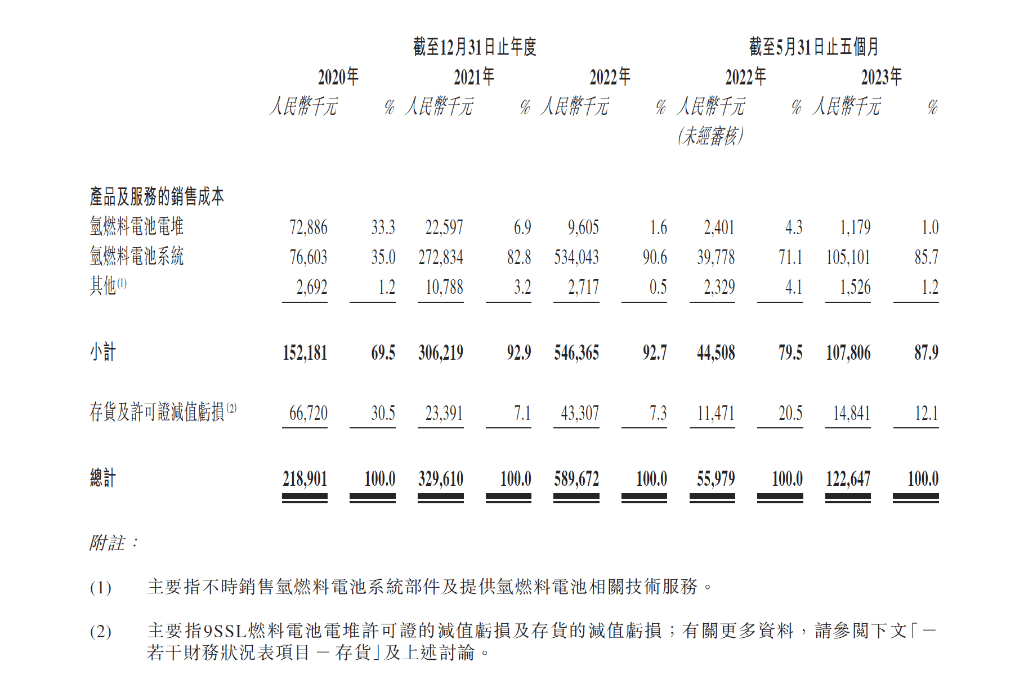 关于2022年成本大幅增加,公司表示是,应部分客户要求,并为了满足客户更全面及随时可用的氢燃料电池解决方案,所以公司从第三方供应商采购储氢系统及电池,并将连同氢燃料电池系统一起提供,进而导致出成本上升。