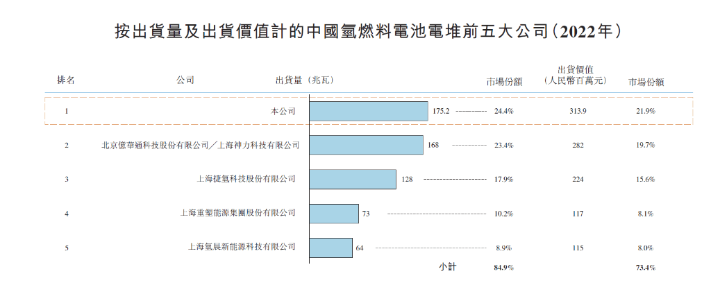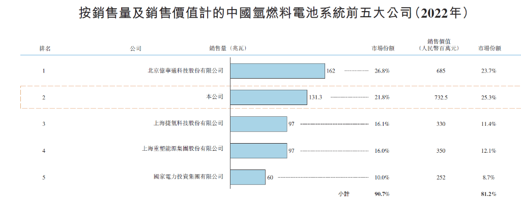 氢燃料电池系统,国鸿氢能排第二。按销售量统计,2022年中国燃料电池系统的市场规模约602.8MW,国鸿氢能燃料电池系统销售量约131.3MW,在氢燃料电池系统销售中排第2,市占率21.8%,按销售价值计算,市占率排第一。