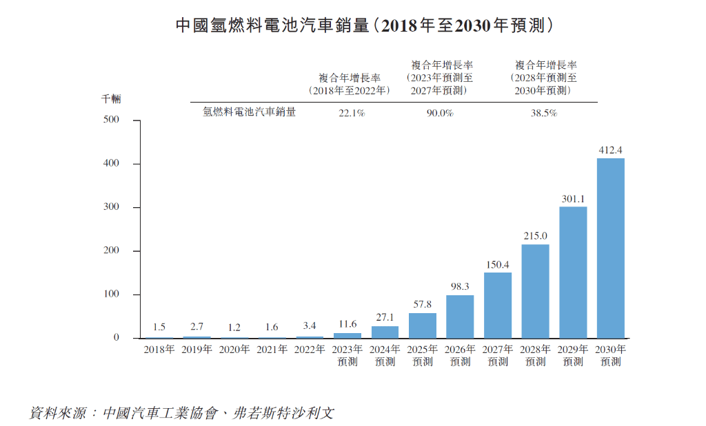 氢燃料电池的应用领域包括交通运输,电力和能源存储,航空航天,军事应用等,其中氢燃料电池汽车是氢燃料电池最重要的应用领域之一。2022年应用于汽车的氢燃料电池系统占氢燃料电池总量约97.7%。2018年至今中国氢燃料电池汽车行业仍处起步阶段,销量虽然年复合增长率约22%,但总量均在5000辆以下,但是随着政策补贴以及鼓励燃料电池发展,伴随技术突破,加氢站等基础设施完善,燃料电池汽车销量将进入类似电动车的成长期。预计2023年将达到1.16万辆,预计2027年将达到15万辆,年复合增长率近90%。