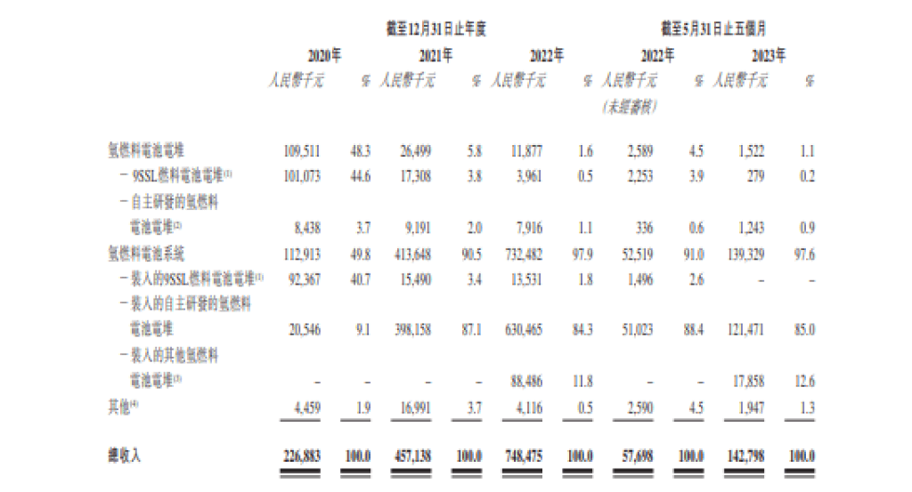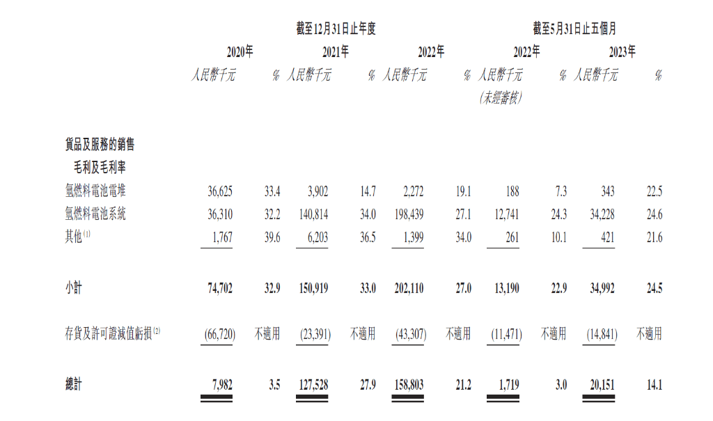 营收方面,国鸿氢能的氢燃料电池电堆的平均售价从2020年的2914.2元人民币/千瓦降至2023年5月31日的1727.6元人民币/千瓦,三年多时间降幅达40.7%;氢燃料电池系统的平均售价从2020年的1.04万人民币/千瓦降至2023年5月31日的3756.5元人民币/千瓦,三年多时间降幅63.96%。主要由于氢燃料电池系统售价整体呈下降趋势及每千瓦平均原材料成本下降所致。