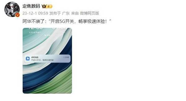 【手机中国新闻】12月1日,据一位数码博主爆料,华为向大量用户推送了“开启5G开关,畅享极速体验”的消息。据该博主补充说明,目前手机界面上方没有实际的变化,估计下一个版本会进行相应的改动。
