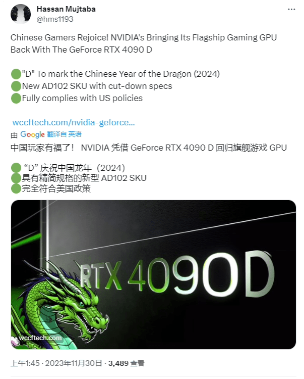 驱动中国2023年11月30日消息,近日,据外媒报道,有消息来源表明 NVIDIA 即将为中国玩家推出一款新的特殊 GPU。这款特殊的 GPU 被称为 GeForce RTX 4090 D这是中国特供型号,基于新型 AD102 设计,旨在作为 RTX 4090 的替代品进行出货。