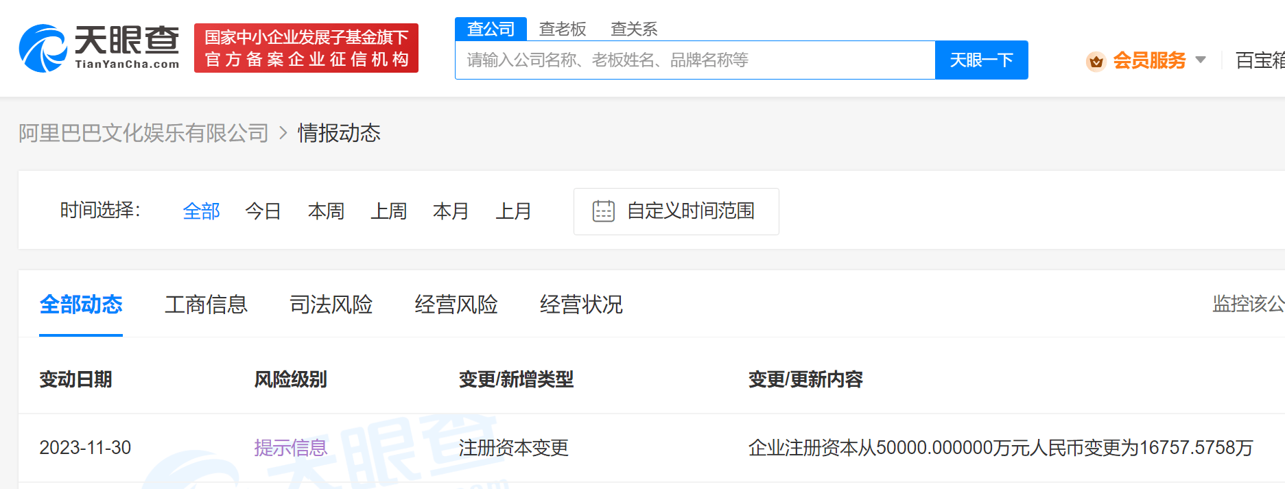 原标题:阿里文娱公司注册资本由5亿元减至1.68亿元