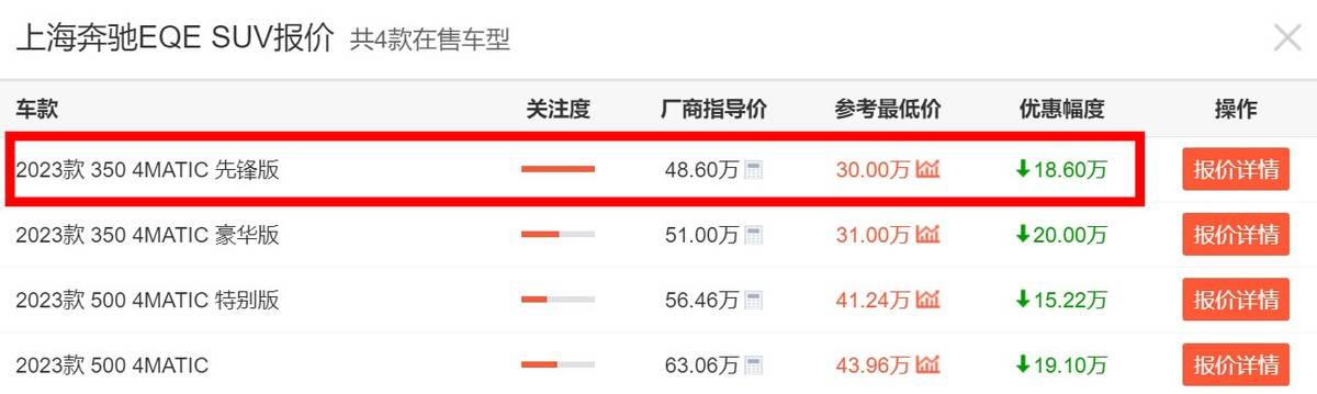 再来看价格,指导价48.6万起的奔驰EQE SUV,目前在上海地区已经能够拥有18.6万的优惠,而降完价之后,原先起售价将近50万的奔驰EQE SUV,现在也已经只需30万的价格便能够买。那花30万就买一台奔驰品牌的纯电动中大型SUV,而且还不用缴纳购置税,这还不够有吸引力吗?我是真的不懂,大家不妨说说看,为什么没啥人买这车。