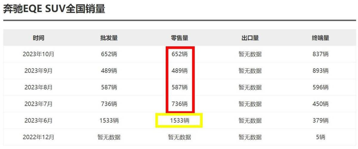 从销量上来看,奔驰EQE SUV在今年的5月27日才正式上市,而在次月(6月),该车系也交出了1533辆新车的销量成绩单。本以来一千多辆的数据应该会成为EQE SUV的销量常态,却没曾想到,到了7、8、9、10月,奔驰EQE SUV仅分别交出了736辆、587辆、489辆、652辆的销量成绩单。所以通过这一销量事实或许也就能够证明:EQE SUV在国人心目中的确是不太受欢迎的。