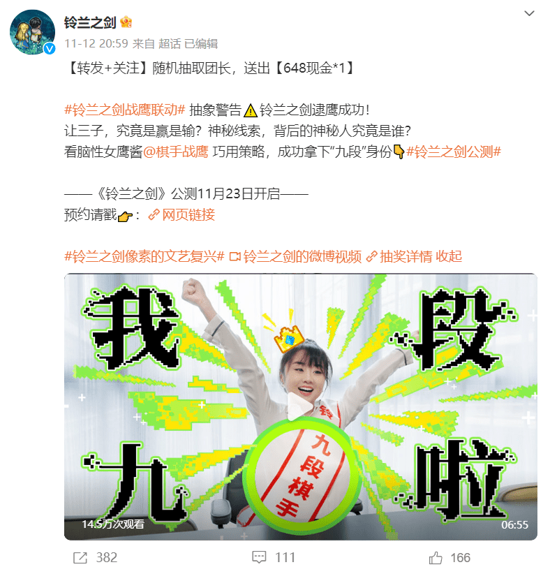 11月12日公布与“战鹰”联动,连着6天发布“整活内容”,打造“战鹰小剧场”将内容分为三弹,把玩梗融入视频内容,详细介绍了游戏玩法、展示游戏画面。