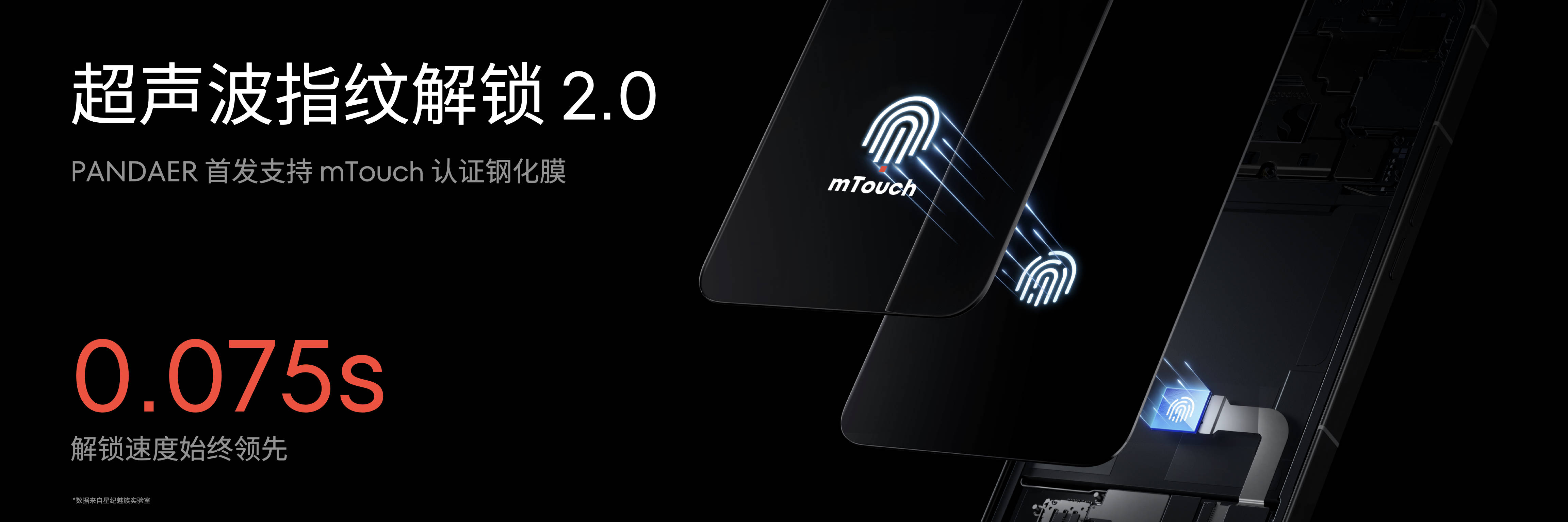 通过搭载行业领先的超声波指纹解锁2.0,可以实现0.075秒极速解锁,无惧湿手,精彩内容,一触即发。