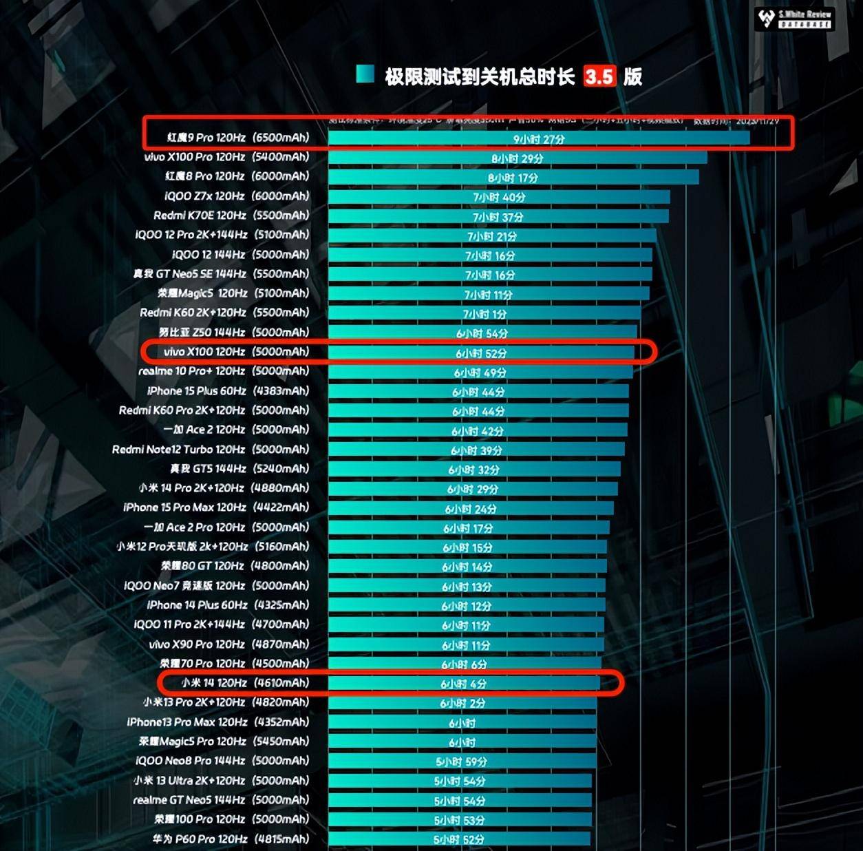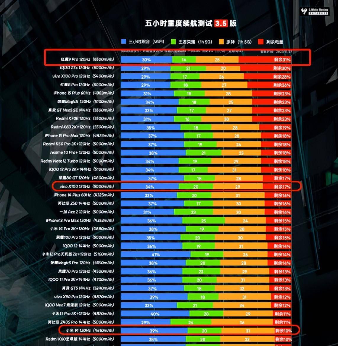 在@小白测评数据中,红魔9Pro五小时重度续航测试剩余31%,极限续航测试直到关机红魔9Pro共坚持9小时27分钟;小米14五小时重度续航测试剩余10%,极限续航测试直到关机小米14共坚持6小时4分钟。就续航方面的测试数据来看,红魔9Pro系列的续航能力领先小米14系列还是非常明显的。