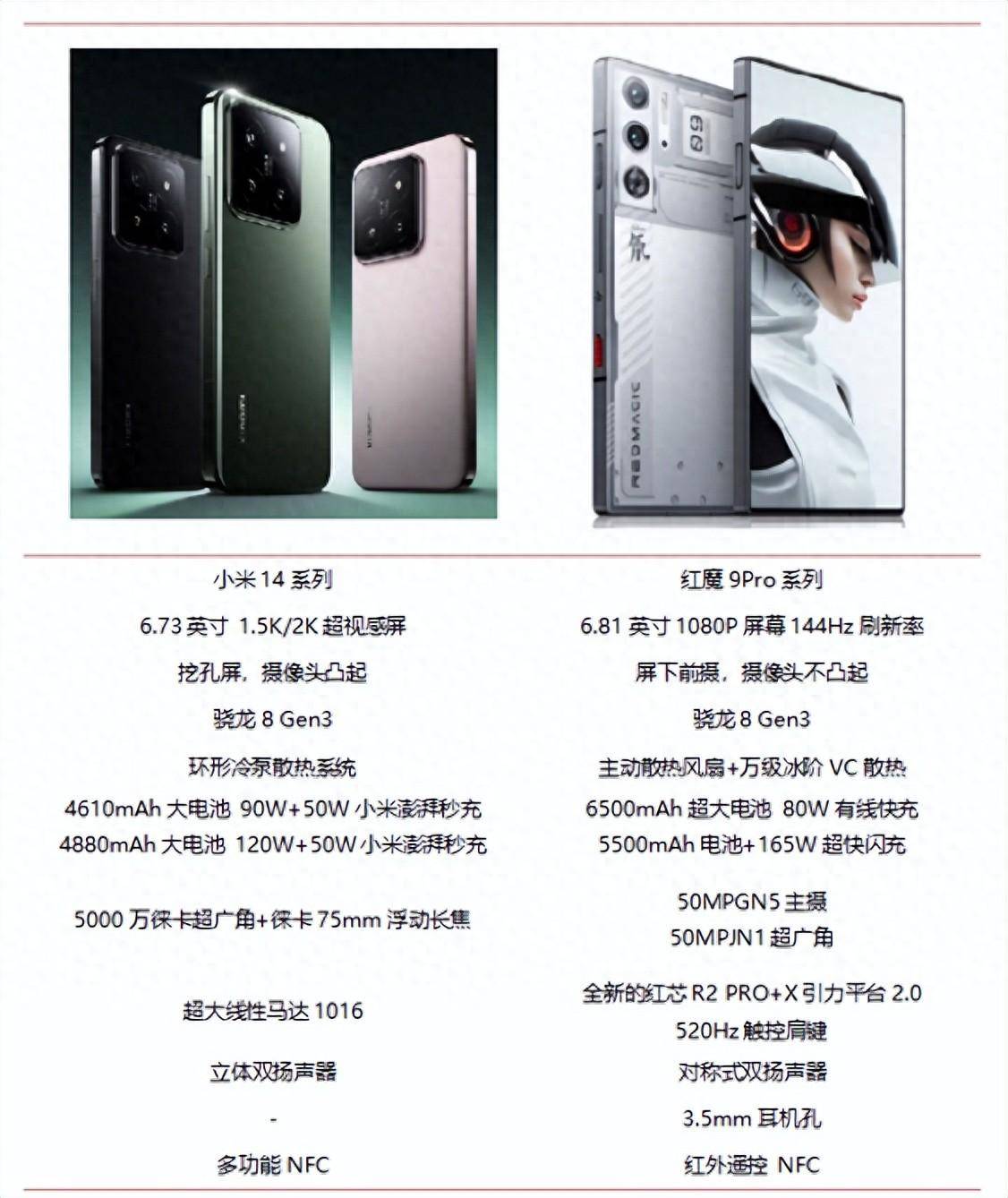 如今的红魔手机虽依旧说是“专业电竞旗舰”,更像一部全面的“高性能旗舰”。小到外观设计,大到性能提升、续航、影像、红外遥感、NFC等,凡是高端智能手机所具备的功能,红魔都做到了大差不差。就拿最近新发布的红魔9Pro系列来说,作为红魔全新的电竞,此次在外观、性能、续航等诸多方面实现了多方位的突破。那么,与之前发布的小米14系列相比,谁的表现更佳呢?一起来看。