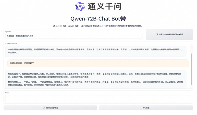 据介绍,Qwen-72B可以处理最多32k的长文本输入,在长文本理解测试集LEval上取得了超越ChatGPT-3.5-16k的效果。研发团队优化了Qwen-72B的指令遵循、工具使用等技能,使之能更好地被下游应用集成。比如,Qwen-72B搭载了强大的系统指令(System Prompt)能力,用户只用一句提示词就可定制AI助手,要求大模型扮演某个角色或者执行特定的回复任务。