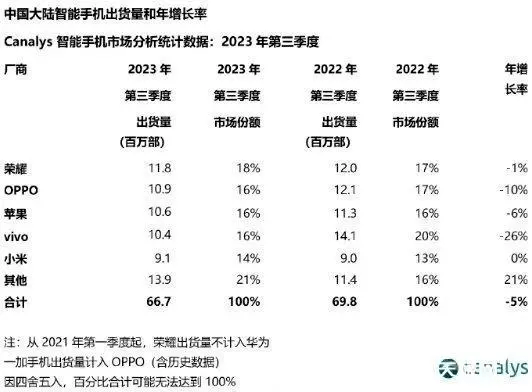 分析机构Canalys近日发布报告,2023年第三季度,国内智能手机市场出货量虽然连续两个季度跌速平缓,但仍同比下滑5%至6670万部。其中,OPPO和vivo都出现了大幅下滑,最大下滑幅度高达26%,即便是处于重新夺回市场阶段的荣耀,出货量也有所下滑。