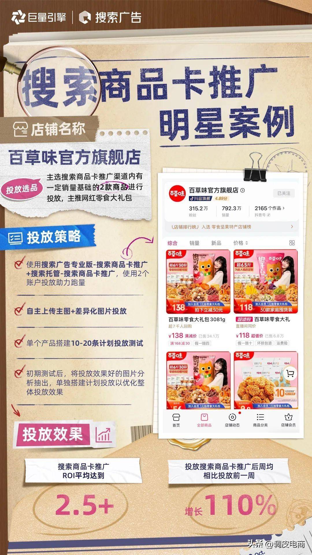 比如百草味,为了拓展抖音商城的客流,投放搜索商品卡推广,ROI平均达到2.5以上,相比投放前一周商品卡GMV增长110%;