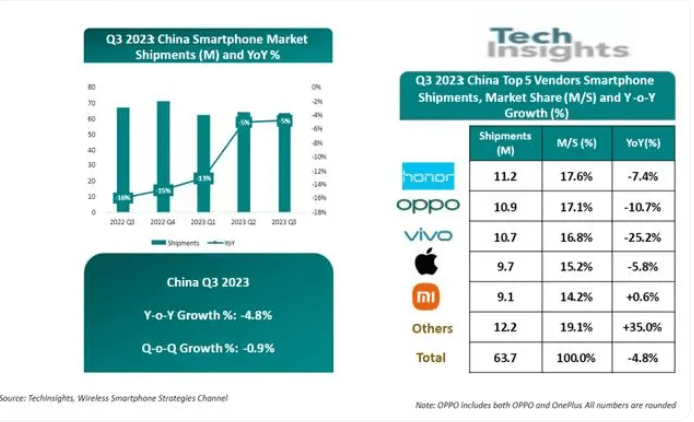 根据TechInsights公布的数据显示,2023年Q3中国智能手机出货量同比下降5%,虽说手机市场的出货量已连续十个季度出现同比下滑。但跌幅速度已经趋于稳定,这表明市场正在触底,TechInsights预计中国市场将在未来几个季度开始复苏之旅。小米副总裁卢伟冰也在接受相关采访时表示,2024年国内手机市场的销量估计能回到2.8亿台以上。