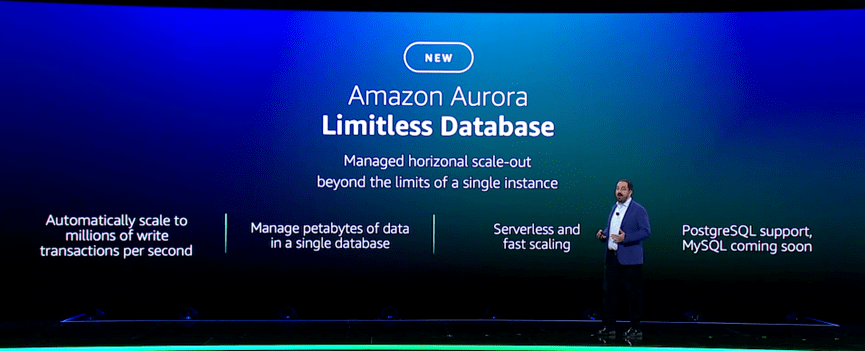 (在本次大会上,Amazon Aurora Limitless Database正式发布,允许系统每秒高性能地写入数百万个事务,并在单个数据库中管理PB级的数据,为数据库的Serverless化真正指明了方向。)