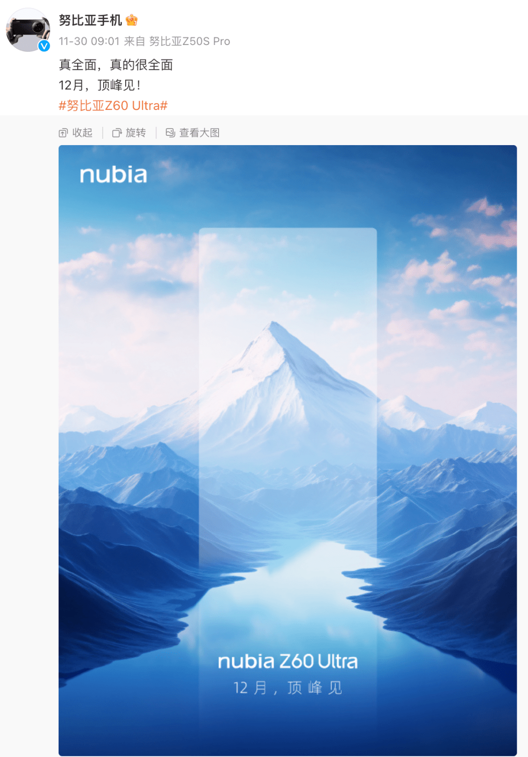 官方预热努比亚Z60 Ultra“真全面,真的很全面”,将于12月和大家顶峰相见。据了解Z60 Ultra将继续采用屏下前置·真全面屏方案,同时依然主打35mm焦段人文摄影,爆料称超广角也升级成了顶配,传感器规格目前属于行业最大,OIS防抖该有的一个都没落。