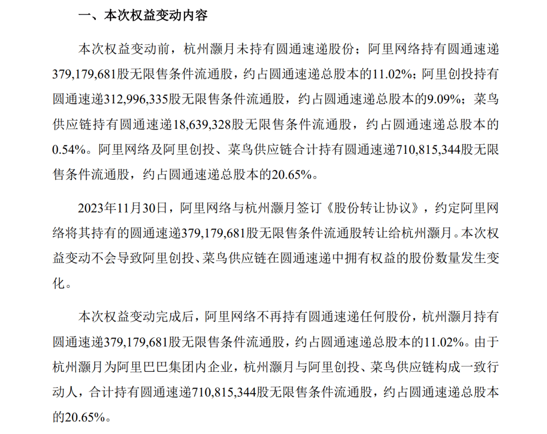 圆通速递公告显示,权益变动前,阿里网络持有圆通速递总股本的11.02%,杭州灏月未持有公司股份;杭州阿里创业投资有限公司(简称“阿里创投”)持有公司总股本的9.09%;浙江菜鸟供应链管理有限公司(简称“菜鸟供应链”)持有公司总股本的0.54%。阿里网络、阿里创投及菜鸟供应链同属于阿里巴巴集团内企业,构成一致行动人,因此合计持有圆通速递总股本的20.65%。