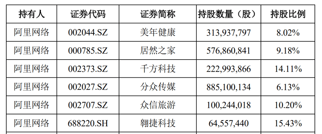 根据公告披露,目前阿里网络在A、H股还有约9家上市公司持股比例超过5%,包括美年健康(持股8.02%)、居然之家(持股9.18%)、千方科技(持股14.11%)、分众传媒(持股6.13%)、众信旅游(持股10.20%)、翱捷科技(持股15.43%)、联华超市(持股18%)、洪九果品(持股7.67%)、汇通达网络(持股17.26%)。