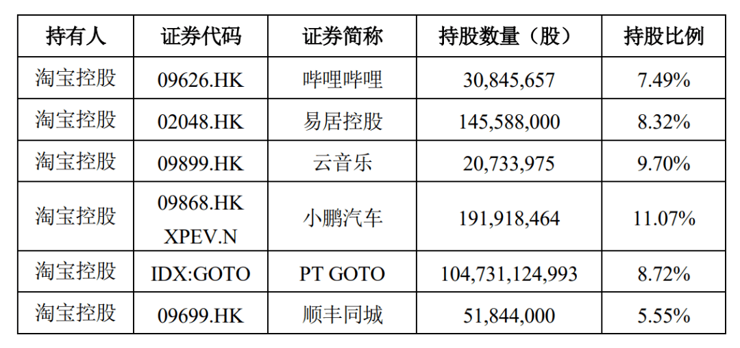 此外淘宝控股还在10家A或H上市公司中持有占比超过5%的股份,包括哔哩哔哩、云音乐、小鹏汽车等。目前尚不清楚淘宝控股是否会做出类似的权益变更的安排。
