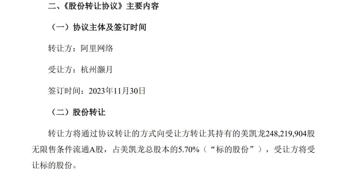 美凯龙也披露了类似的权益变动事项。公告称,阿里网络将持有美凯龙的2.48亿股全部转让给杭州灏月承继。根据转让协议,美凯龙每股转让价格为4.24元,转让价款总额为10.52亿元。