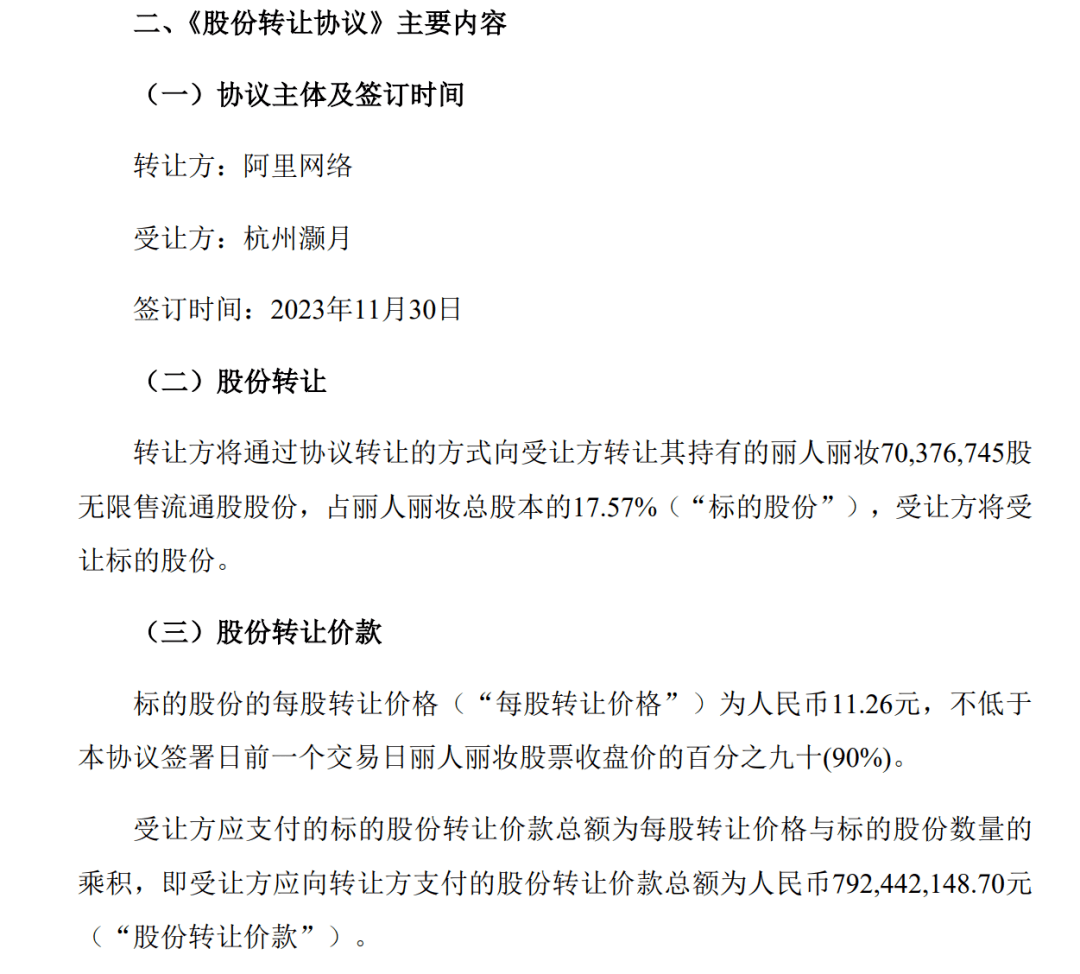此外,丽人丽妆公告,阿里网络拟以11.26元/股价格,协议转让所持7037.67万无限售条件流通股(占丽人丽妆17.57%)至杭州灏月,转让总价合计7.92亿元。