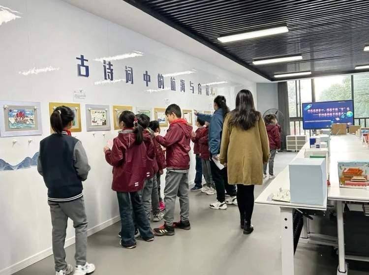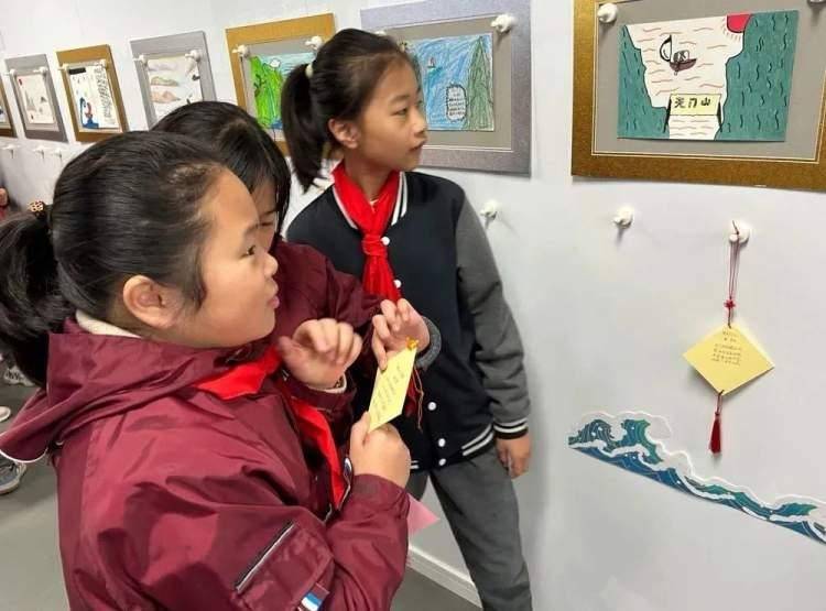 五年级以班级为单位,前往古船楼二楼,他们手拿古诗,认真欣赏三年级的绘画作品,并将对应的古诗悬挂在画作下方。
