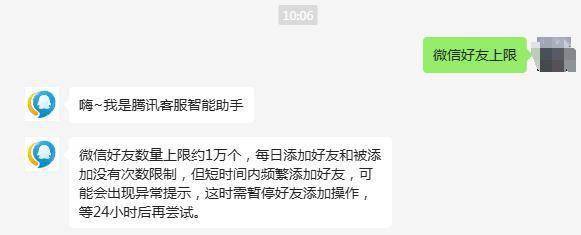 腾讯客服称:微信好友数量上限约1万个,每日添加好友和被添加没有次数限制,但短时间内频繁添加好友,可能会出现异常提示,这时需暂停好友添加操作,等24小时后再尝试。