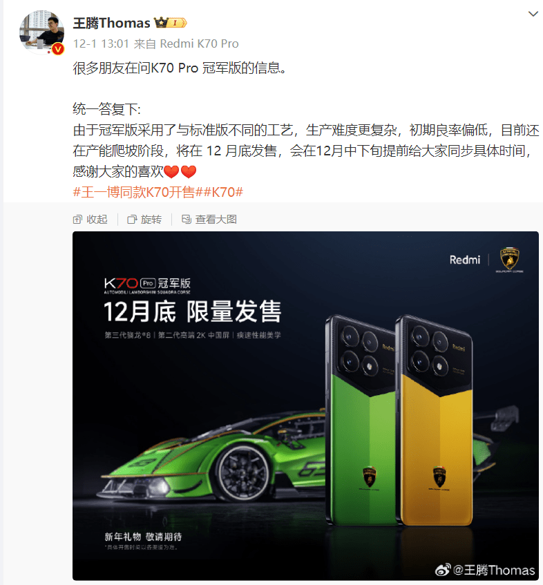 IT之家 12 月 3 日消息,Redmi 市场总经理、Redmi 品牌发言人王腾近日透露,K70 Pro 冠军版采用了与标准版不同的工艺,生产难度更复杂,初期良率偏低,目前还在产能爬坡阶段,将在 12 月底发售,12 月中下旬公布具体时间。